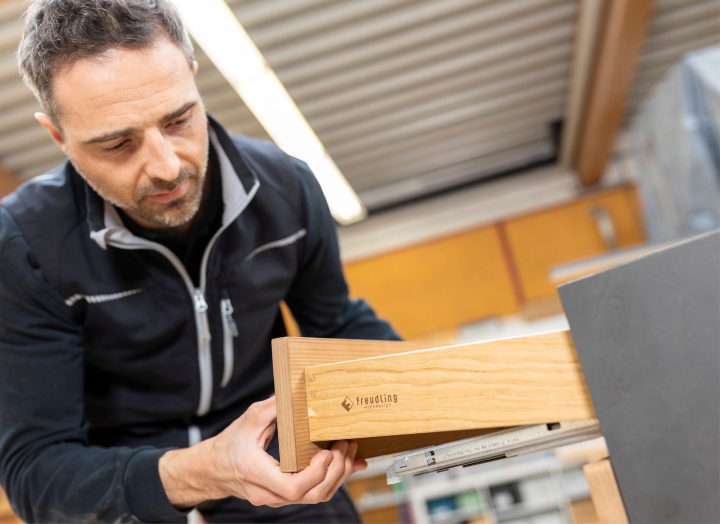 Bei wohndesign freudling sitzt jeder Handgriff. Unser erfahrenes Team der Möbelwerkstätte vereint traditionelles Handwerk mit modernster Technik, um einzigartige Lösungen für Ihr Zuhause zu schaffen. Termingerechte Lieferung sowie Sauberkeit und Präzision beim Einbau durch unsere Montagetischler sind im Hause freudling seit jeher selbstverständlich.