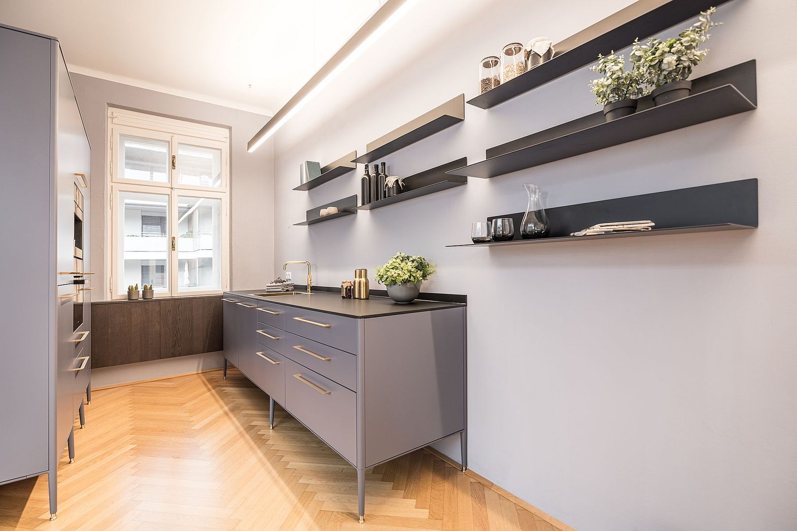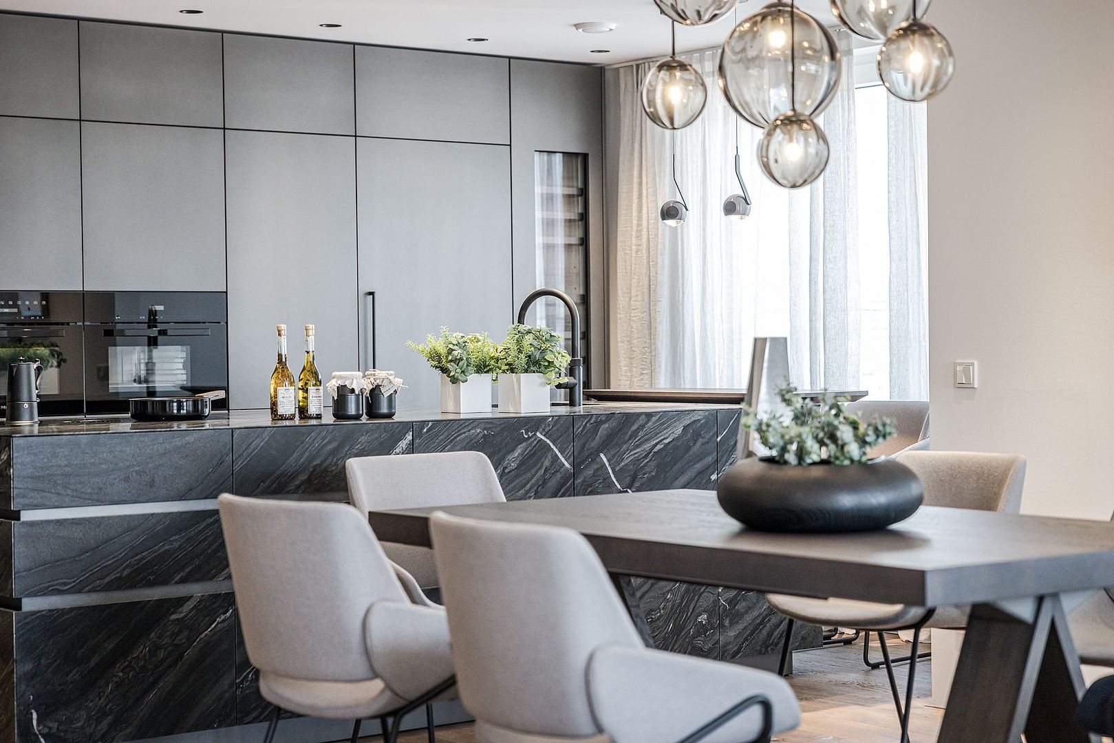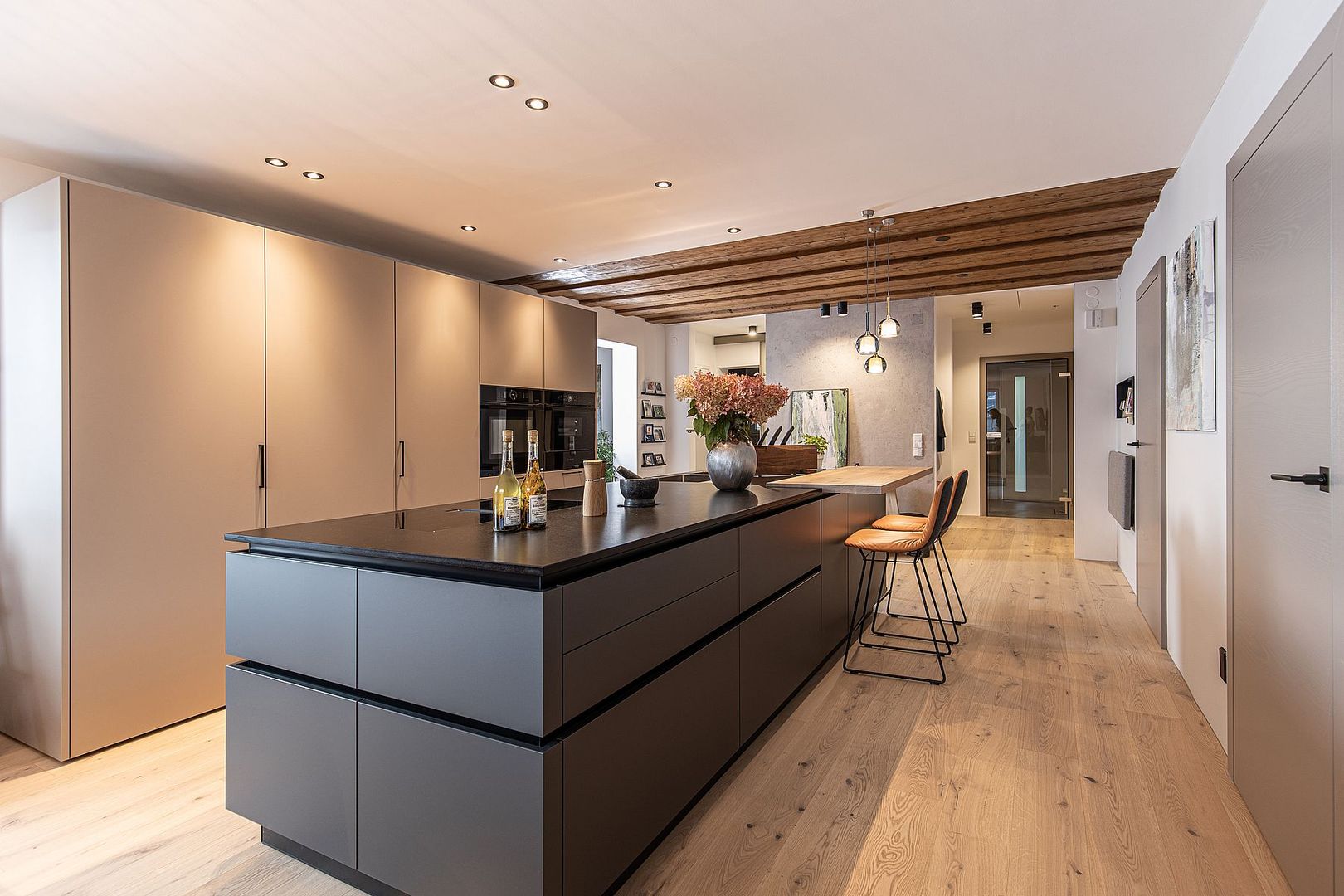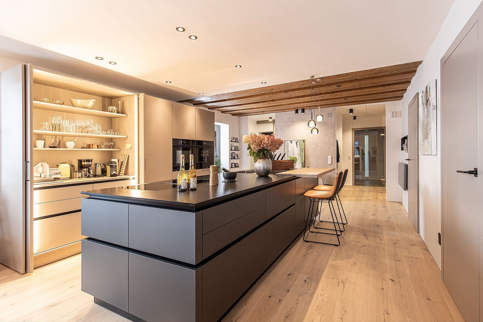 Bei diesem tollen Projekt haben wir eine gesamte Etage neu gestaltet. Die Küche, als Herzstück des Zuhauses, wurde am besten Platz geplant, raffinierte Details, wie die in die Wand integrierte Tür, schaffen eine elegante und fast unsichtbare Trennung zwischen Wohn- und Arbeitsbereichen. Werfen Sie einen Blick in die Bilder-Galerie und lassen Sie sich inspirieren!