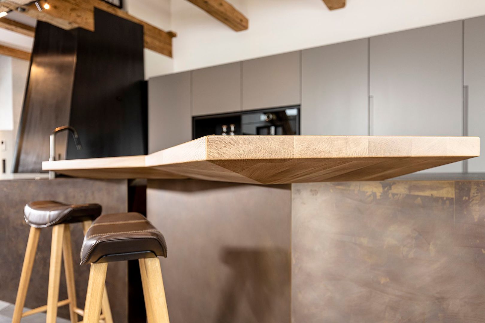 Bei diesem Projekt haben wir die Bereiche Kochen und Essen sowie das Bad neu gestaltet. Durch das Zusammenlegen der Räume entstand ein lichtdurchfluteter Koch- und Essbereich, der Funktionalität und Stil vereint. Wie die bestehende Deckenstruktur in das neue Konzept integriert wurde? Sehen Sie selbst!